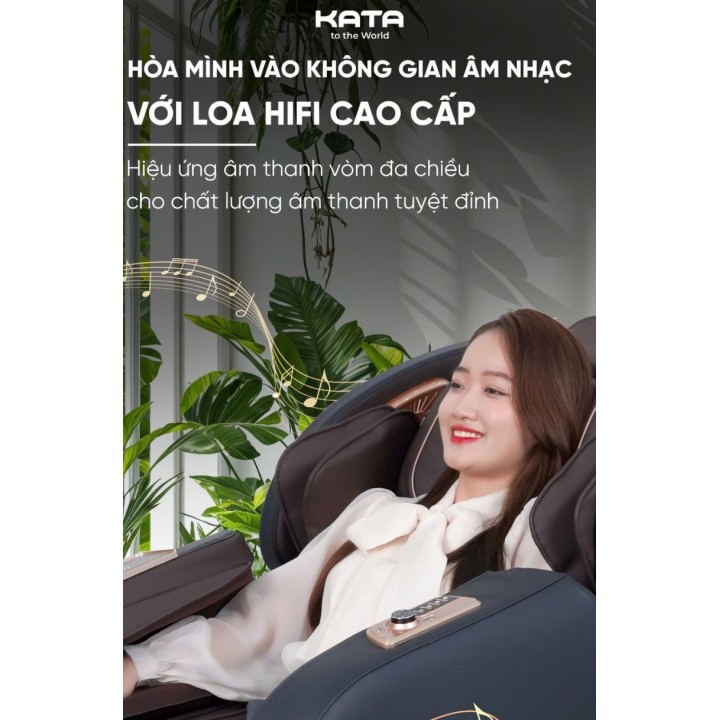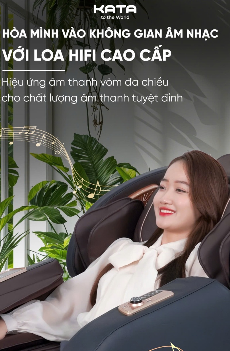 KATA MC01 không chỉ chăm sóc cơ thể mà còn hướng tới thư giãn cảm xúc. Hệ thống loa âm thanh nổi chuẩn Hifi được tích hợp ngay trong thân ghế, mang đến chất âm chân thực, rõ nét và lan tỏa khắp không gian.