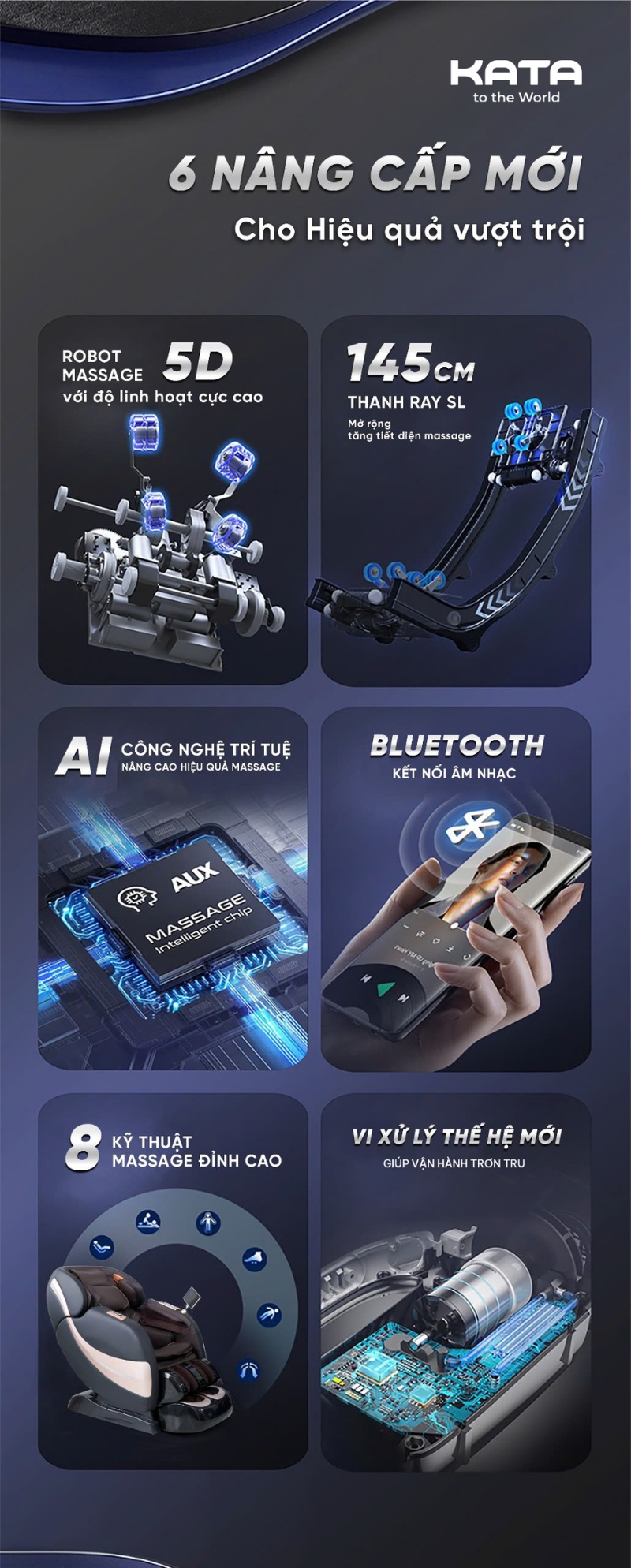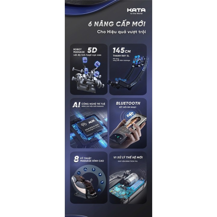 KATA MC01 sở hữu bộ vi xử lý AI cảm biến cơ thể. Công nghệ này cho phép ghế nhận diện hình dáng và thể trạng người dùng chỉ trong vài giây. Từ đó tự động điều chỉnh vị trí con lăng, cường độ túi khí và bài massage phù hợp nhất.