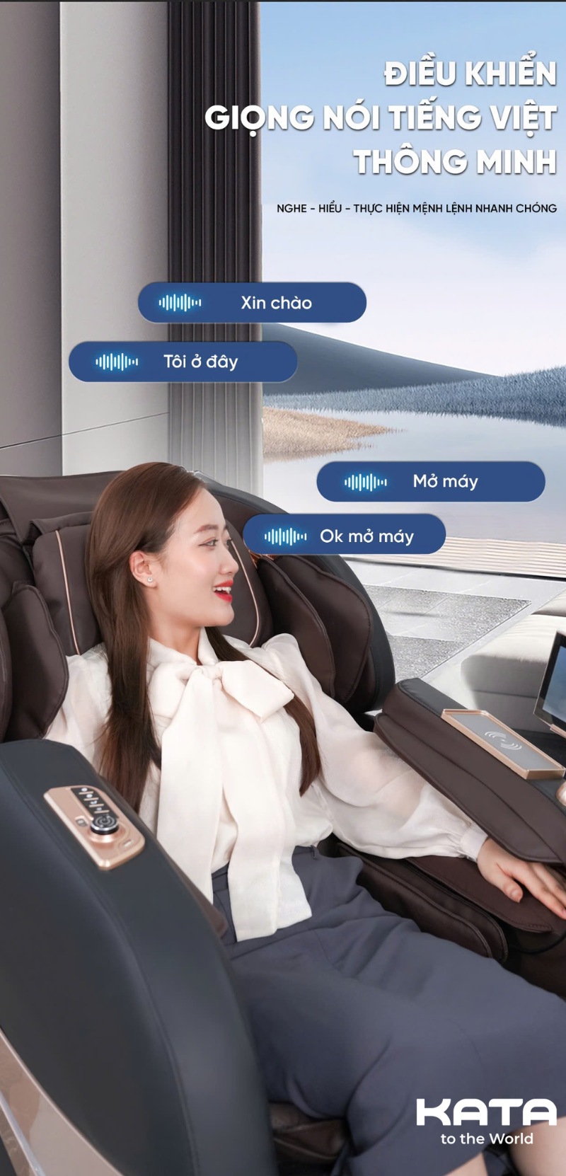 Một điểm cộng đáng giá khác của MC01 là khả năng nhận lệnh bằng giọng nói tiếng Việt. Với các câu lệnh cơ bản như “Tăng lực massage”, “Bật sưởi”, “Ngả ghế ra sau”,… người dùng có thể điều khiển toàn bộ ghế mà không cần thao tác tay.