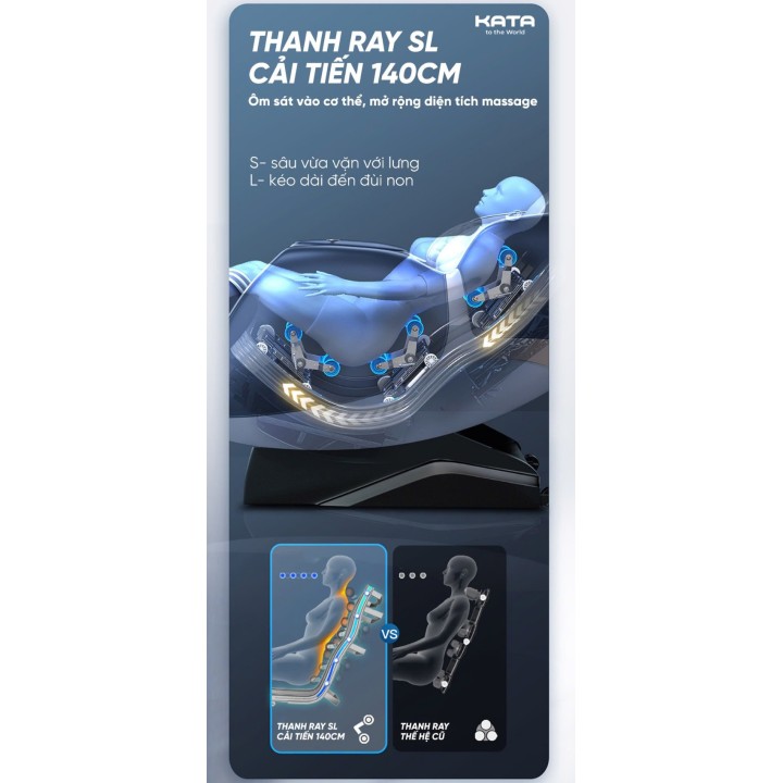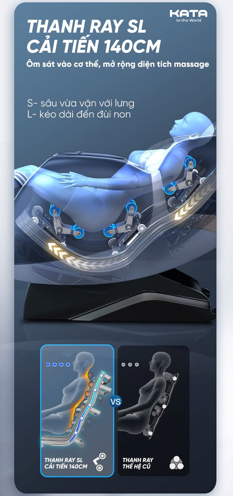 Điểm khác biệt đầu tiên khiến MC04 nổi bật so với nhiều dòng ghế cùng tầm giá chính là hệ thống động cơ cải tiến toàn diện. KATA đã trang bị cho sản phẩm thanh ray SL mở rộng tới 140 cm, cho phép con lăn di chuyển mượt mà từ vùng vai xuống đến tận đùi non.