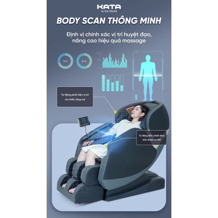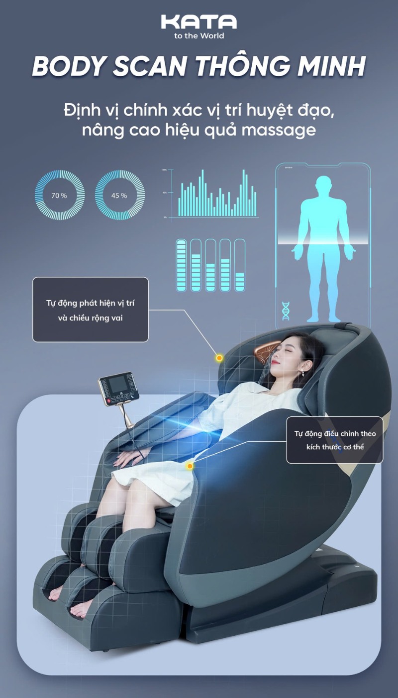 Không chỉ chú trọng đến công nghệ vật lý trị liệu, KATA MC04 còn tích hợp AI Body Scan – công nghệ quét cơ thể thông minh giúp nhận diện chính xác chiều cao, độ rộng vai, vị trí các huyệt đạo để tự động điều chỉnh con lăn phù hợp với từng người.