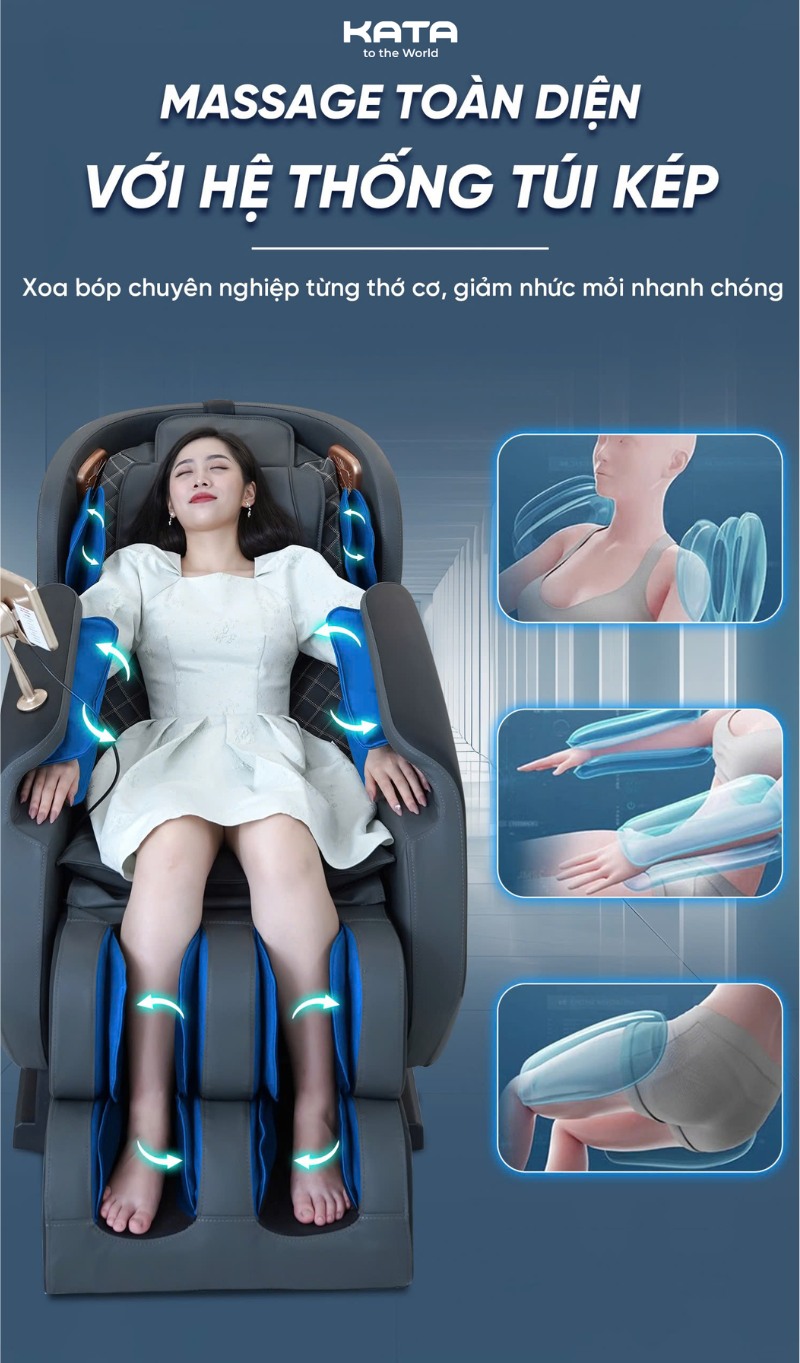Hệ thống túi khí kép được bố trí dọc khắp cơ thể từ vai, cánh tay, bắp chân đến bàn chân. So với túi khí đơn, loại túi khí kép cho phép tác động sâu hơn, co bóp mạnh hơn và phân bố áp lực đồng đều, giúp giảm căng cứng cơ bắp nhanh chóng.