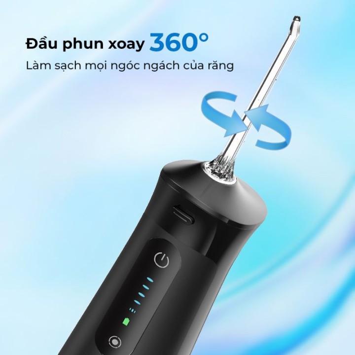 Các đầu phun xoay 360°, dễ dàng tiếp cận mọi vị trí trong miệng kể cả những vùng bàn chải thông thường không thể chạm tới.